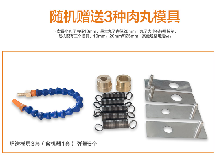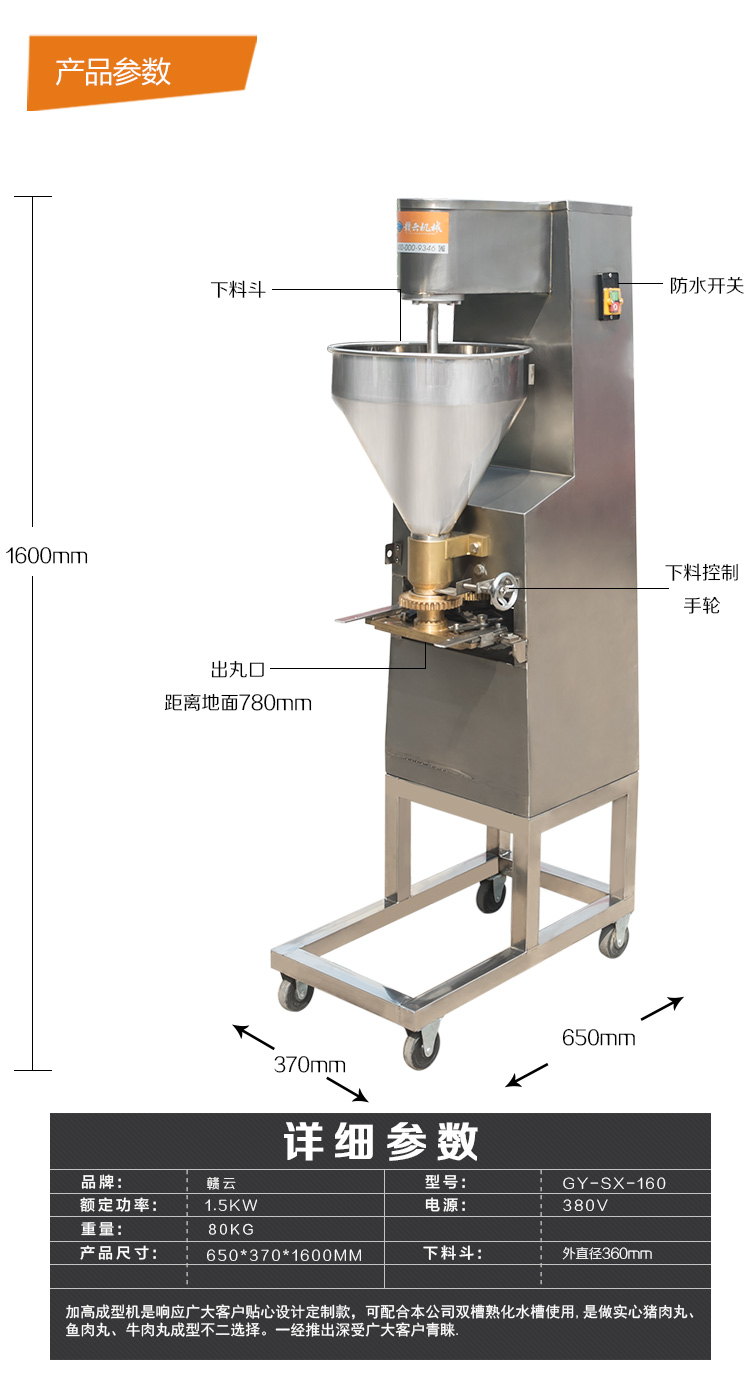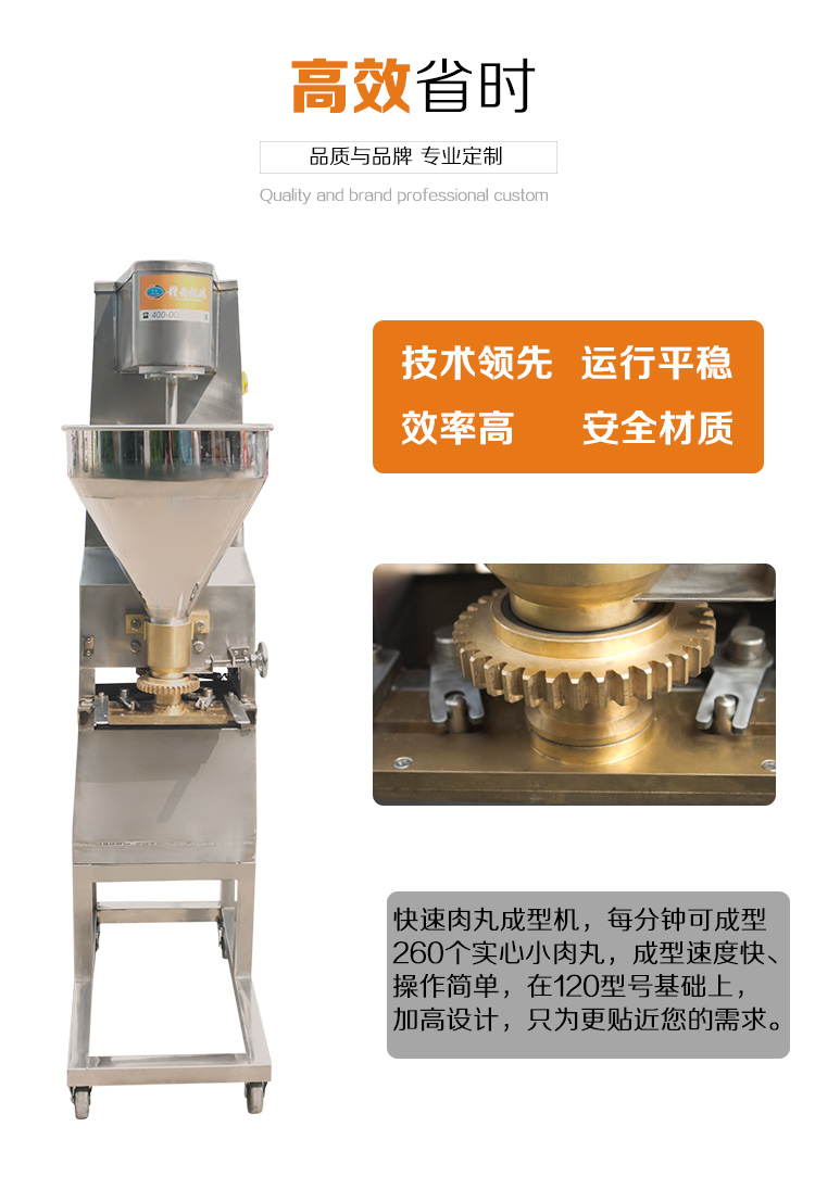 本款160型實(shí)心肉丸成型機(jī)是在120型實(shí)心肉丸成型機(jī)的基礎(chǔ)上加高設(shè)計(jì),生產(chǎn)的肉丸具有密度小,圓度小,外表光滑等特點(diǎn),深受客戶喜愛(ài),適合餐廳、飯店、肉食加工廠使用,還會(huì)贈(zèng)送您獨(dú)特的配方,肉丸成型機(jī)助您快速的占領(lǐng)市場(chǎng)。本款實(shí)心肉丸成型機(jī)是在120型實(shí)心肉丸成型機(jī)的基礎(chǔ)上加高設(shè)計(jì),是配合我司設(shè)計(jì)的雙加熱水槽而設(shè)計(jì),隨機(jī)配15、20、25MM三套成型模具,可做三種規(guī)格丸子,采用絞龍推料擠壓,切刀快速切割成型原理設(shè)計(jì)。隨肉丸成型機(jī)帶有詳細(xì)的操作說(shuō)明。