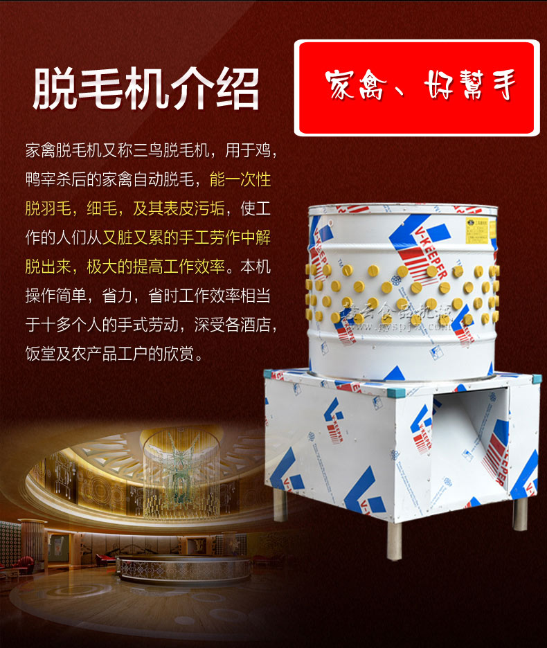 我們生產的這款打雞鴨毛的機器內置的都是國標銅芯電機,可以供您用很久很久,每一臺全自動家禽褪毛機出廠之前都是經過了測試的,確保每一臺的實用性,加工廠雞鴨脫毛機操作簡單方便,只需要將燙好的雞鴨扔進去啟動機器即可,雞鴨鵝脫毛機器一直以來都是非常受歡迎的好設備,有需要的可隨時撥打電話。8373422對于全自動家禽褪毛機我們是全國聯保一年的,無論您是在哪個城市均可以,一直以來我們都以生產加工廠雞鴨脫毛機為主要目標,現如今雞鴨鵝脫毛機器已經深得大眾的支持和好評了,打雞鴨毛的機器現已紅遍大江南北,成為食品加工業不可缺少的一款設備,更多詳情歡迎隨時來電。