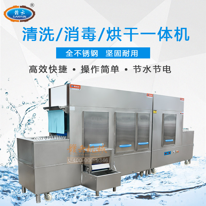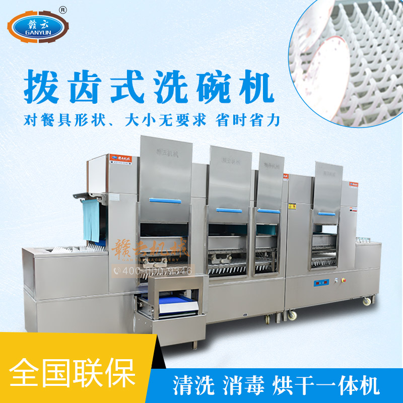 贛云新款長(zhǎng)龍式式洗碗機(jī),本系列產(chǎn)品經(jīng)過(guò)除渣、初洗、清洗、漂洗、消毒、烘干一體化流水線(xiàn)操作,清洗簡(jiǎn)單,撥齒型傳送帶,能更好的固定碗碟,洗滌過(guò)程中不易碰撞損壞,采用斜插式傳送,不需裝筐,不必考慮形狀,直接擺放清洗即可;碗碟斜插式進(jìn)入清洗,清洗無(wú)死角。