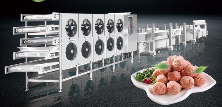 設備流程展示:凍肉切塊機―輸送提升機―絞肉機―智能液壓升降打漿機―變頻雙調速肉丸成型機―肉丸緩沖區―低溫定型流水線―高溫熟化流水線―水冷槽―提升機―多層風冷線