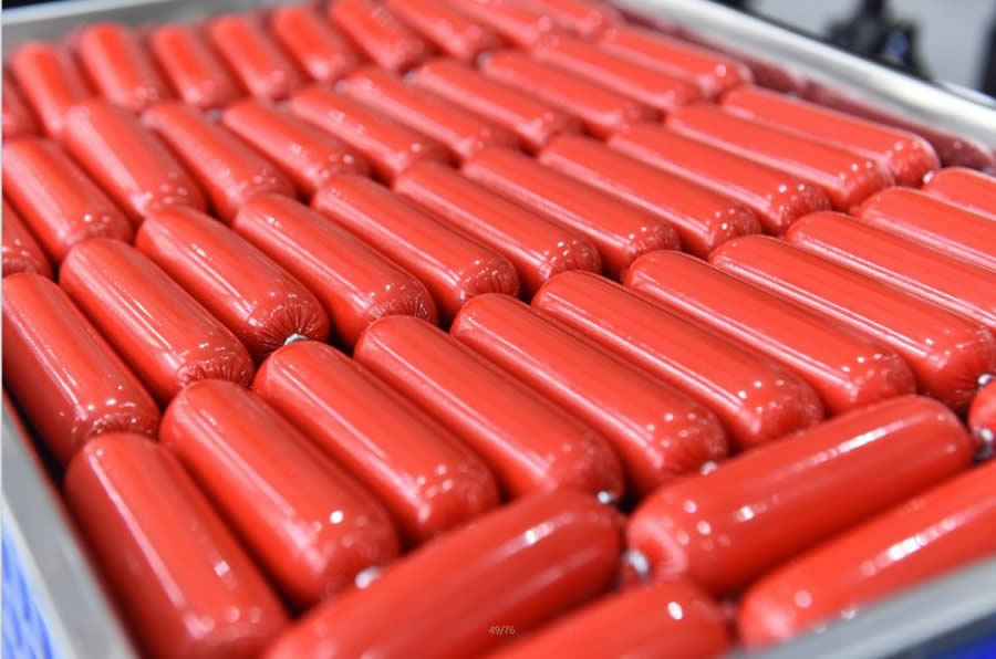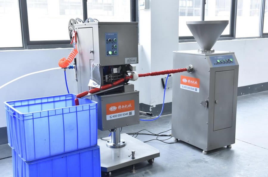 火腿腸肉漿加工好了,接下來就是灌腸打扣了,自動化灌腸打扣一體機,告別傳動半自動灌腸手動打扣的低效率和繁瑣,肉漿一倒,機器一開,參數一調,灌腸打扣一步到位,自動化灌裝,精準灌火腿腸,每一節都是一樣飽滿,每一節都是一樣長。