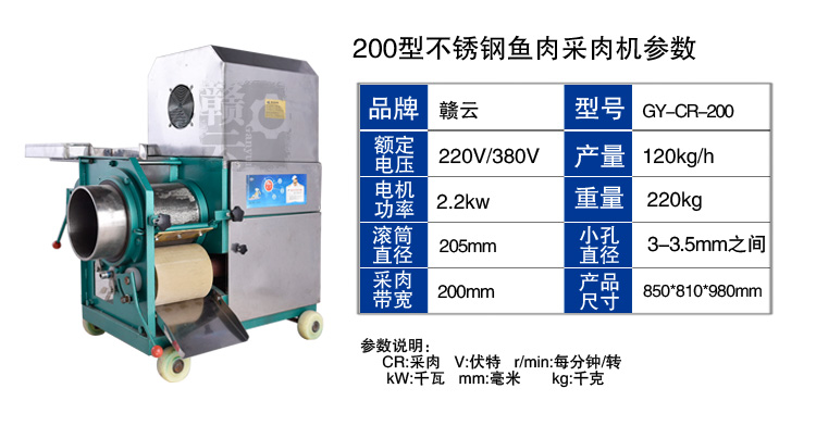 贛云牌魚肉分離機又稱之為魚肉采肉機、魚糜采取機、蝦殼分離機、去魚骨機、泥鰍采肉機、去魚刺機,通過擠壓原理將魚肉和魚骨等分離開來,魚肉采肉前需漿活魚去頭部和內臟。贛云牌魚肉分離機有普通材質和不銹鋼材質之分。